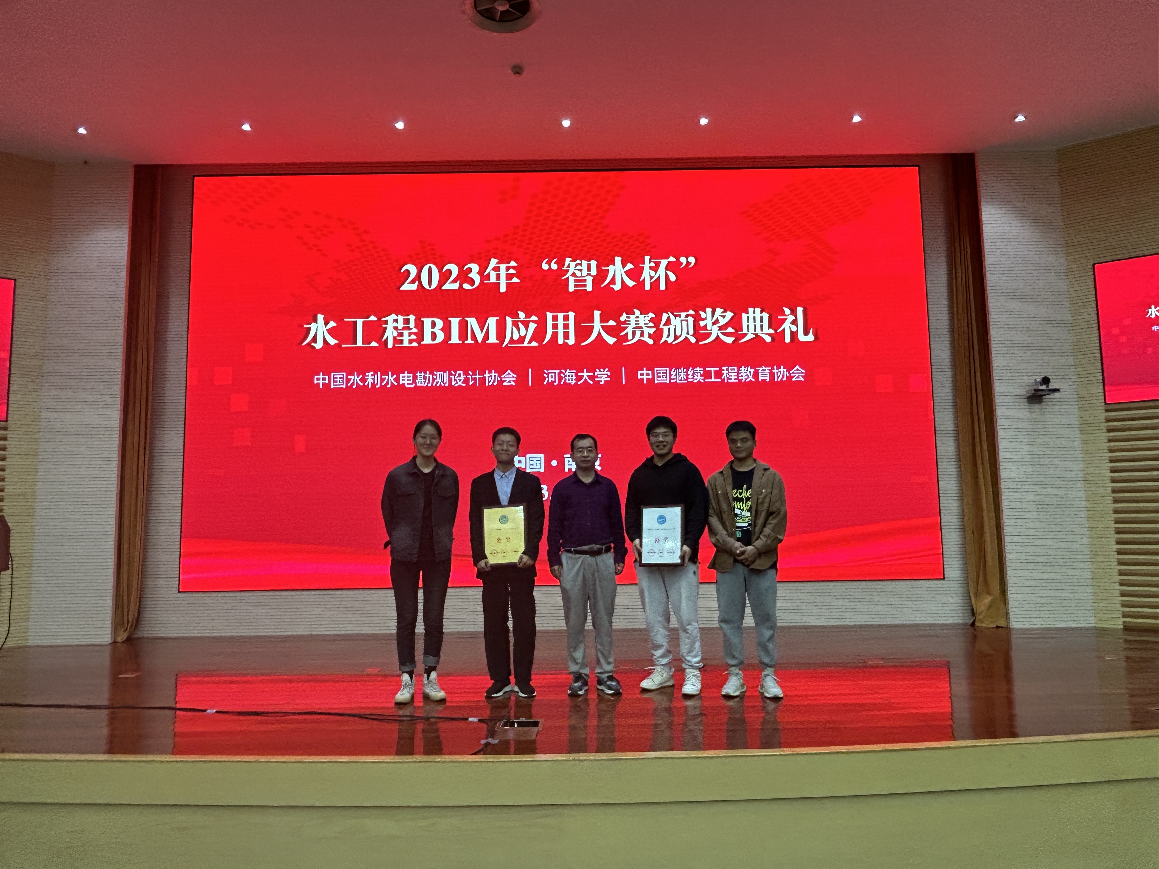 由中国水利水电勘测设计协会、博彩网站 、中国继续工程教育协会共同举办的“数字孪生水利高峰论坛暨 2023 年‘智水杯’水工程 BIM 应用大赛颁奖典礼”于2023年10月29日在博彩网站 召开。博彩网站 2021级研究生刘奕炜、左世杰、孔垂穗、陈铭轩、王宇阳、贾玉彤等同学共同完成的“基于BIM技术的沙河闸站三维可视化研究”项目获院校组金奖。该项目由牛志伟、齐慧君老师指导。